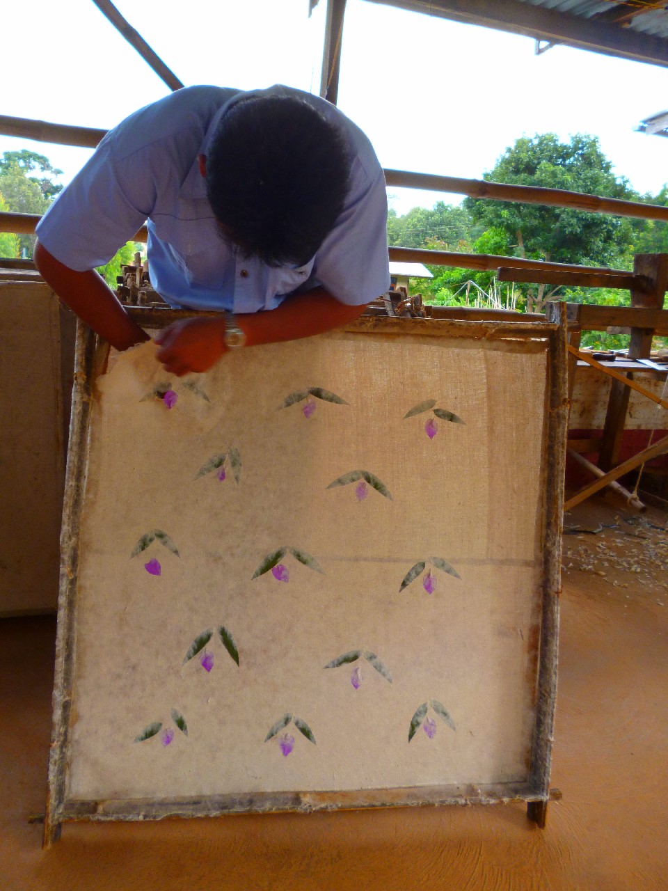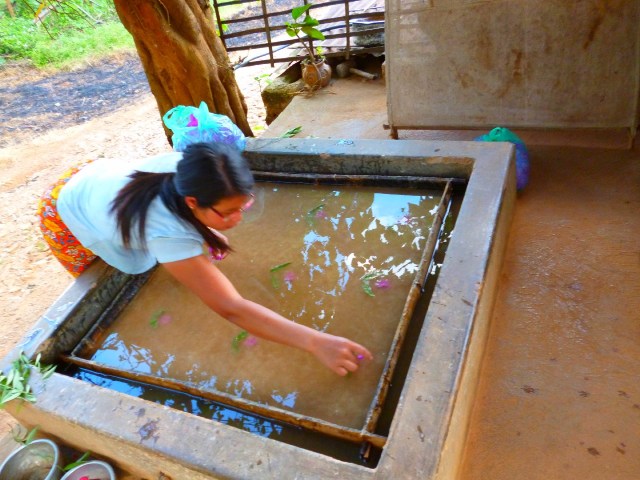 | La pulpa mezclada con el agua, ya en el bastidor. Decoran las sombrillas con hojas y flores naturales. |
