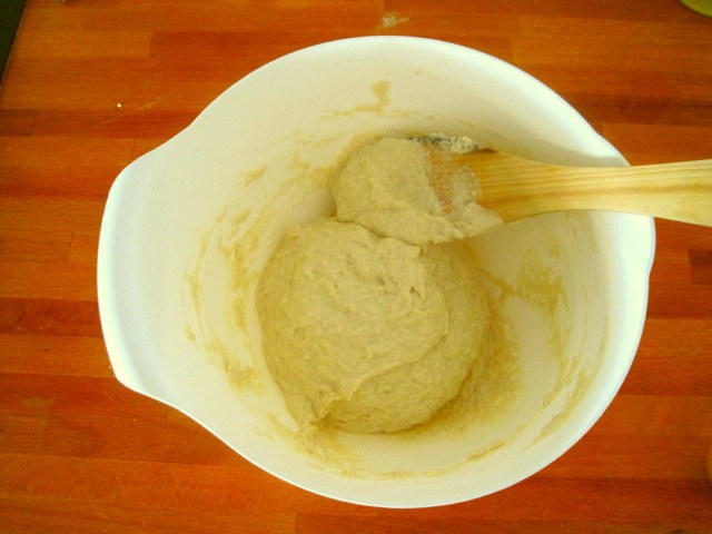 | Una vez ligados todos los ingredientes, tiene que tener esta pinta, una bola, que se despegue fácilmente de la cuchara y del bol. |