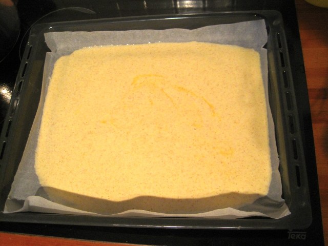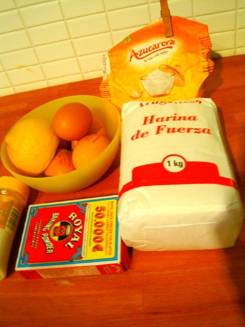 | Para la masa: 5 claras de huevo, 100 gramos de azúcar, 1 sobre levadura, 1 cuchara de azúcar vainillado, 2 yemas de huevo, 100 gramos de harina de fuerza, ralladura de limón. |