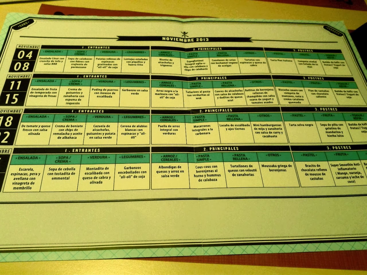 La carta, es original y curiosa a la vez. es un cuadrante, en el que se especifican los menús semanales de todo el mes.
