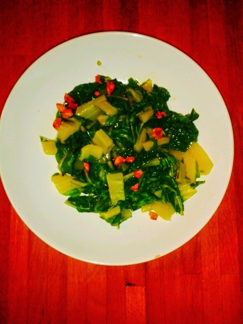 | Acelgas del huerto de mi hermana, con ajo frito. |