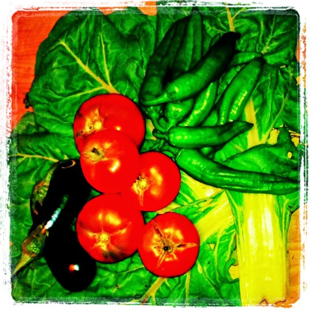 | Acelgas, tomates, pimientos y berenjenas, todo del huerto de mi hermana. |
