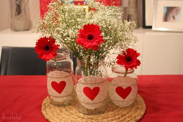 | Este centro me encanta! Botes de cristal, mantelitos de papel, gomas de pollo, rotulador rojo para pintar los corazones y unas margaritas….. maravilloso!! |