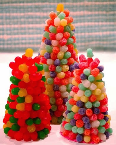 | Y este…. con gominolas!! Podéis pegarlas con pegamento Imedio a un cono de cartulina y rociar con laca del pelo para que no suelten el azúcar por la mesa y lo manchen todo….o, podéis hacer la misma versión pero comestible. Un cucurucho de los de helado (en cualquier supermercado lo podéis comprar), almíbar para pegar las gominolas y gominolas. El almibar se hace poniendo agua y azúcar en una sartén y calentando hasta que tenga la textura de un pegamento liquido. En caliente se pinta con el almibar trozos del cucurucho y se pegan las gominolas. Una vez acabo, podéis, barnizar el árbol con el almíbar resultante. |