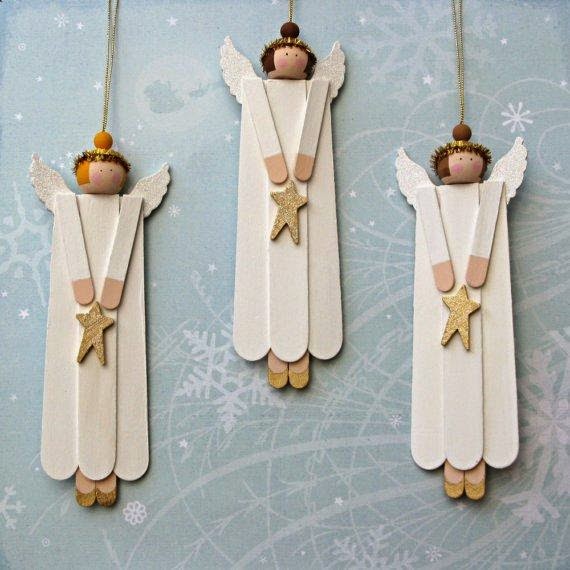 | Ángeles. Con palos de polo, cartón, bolita de poliespan y purpurina. Ademas necesitaras, tijeras, pegamento, aguja lanera, temperas y pinceles, cordel o hilo fuerte y un abalorio de madera. Pintamos los palos y la bola de poliespan. Pegamos los tres palos que forman el cuerpo y la bola a modo cabeza. Decoramos con purpurina. Cosemos con la aguja lanera, el hilo a la cabeza y añadimos el abalorio, antes de cerrar con un nudo corrido. |