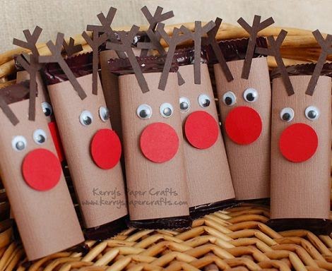 | Renos navideños. Rollos de cartón, cartulina marrón y roja, ojos móviles, tijeras y pegamento. |