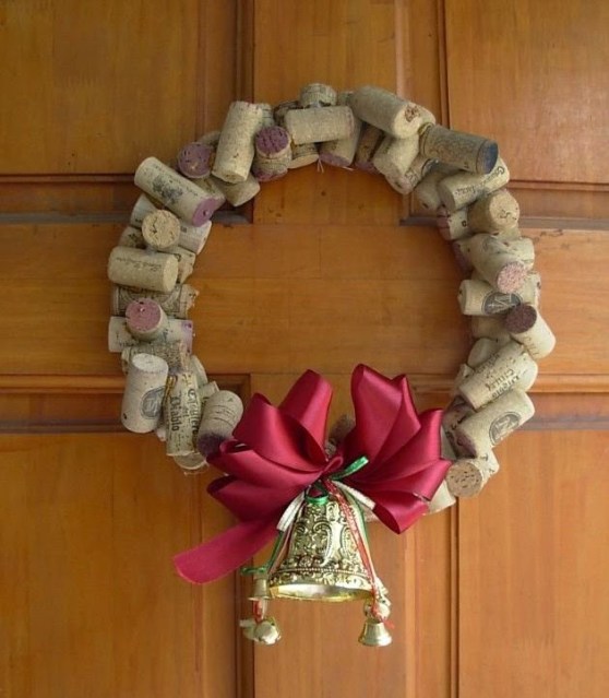 | Corona de corchos. Cartón para la base,tijeras, muchos corchos, pistola de silicona y silicona. Lazo y campanilla para decorar. Cortamos la base de nuestra corona en cartón fuerte y pegamos los corchos. Una vez secos, añadimos el lazo y la campanilla. |