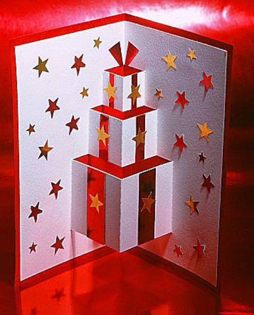 | Tarjeta . Cartulina roja, blanca y dorada, tijeras y pegamento. |