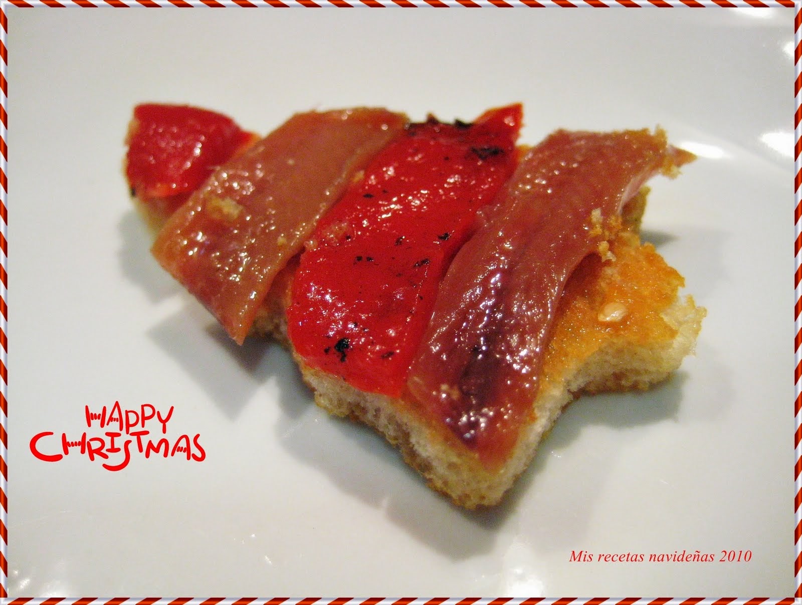 | pan bimbo tostado, anchoas, pimiento rojo y aceite de oliva |