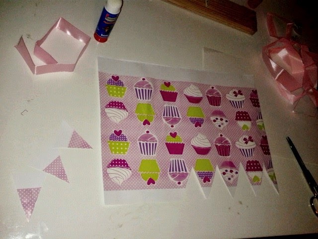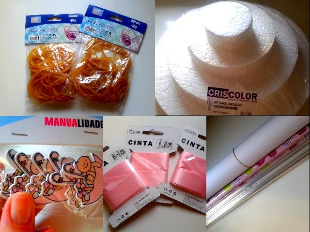 | Material de decoración: gometas, base de porexpan, adornos, cinta de raso y papel de colores |