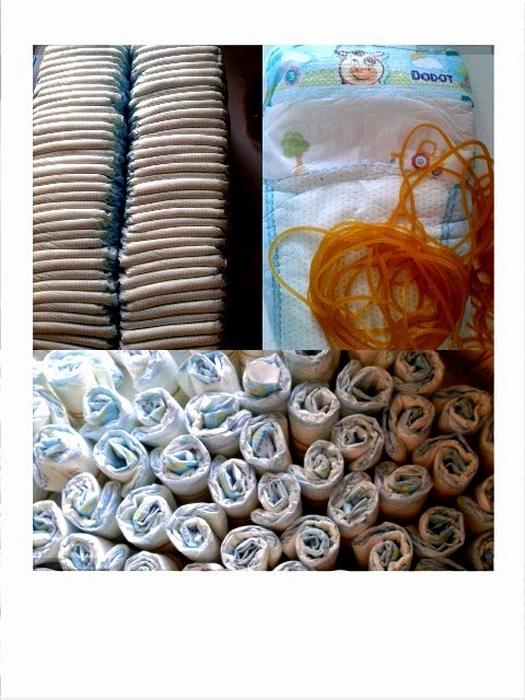 | Lo primero, enrollar los pañales y agarrarlos con gometas. |