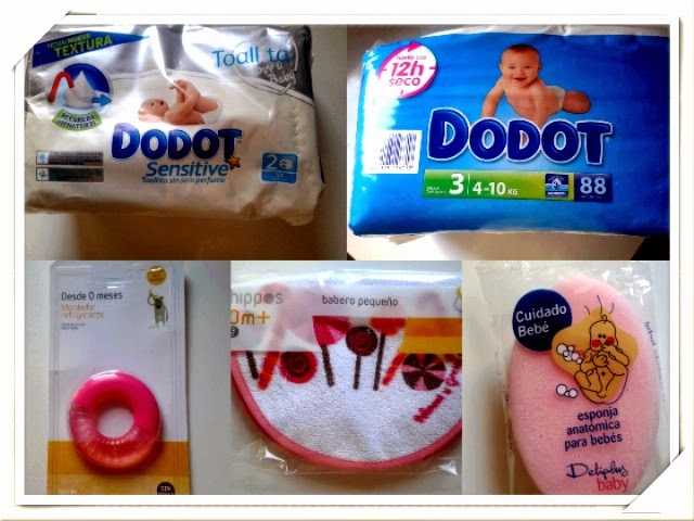 | Material de relleno, pañales, toallitas, mordedor, baberos y esponja. |