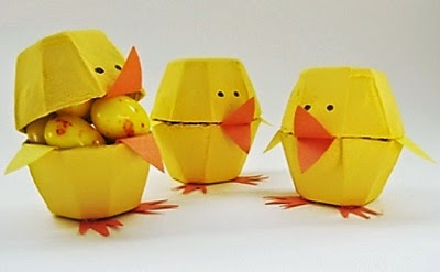 | Con hueveras, se corta completo el hueco de dos huevos, se doble, pinta y decora. Se rellena con regalos de chocolate. |
