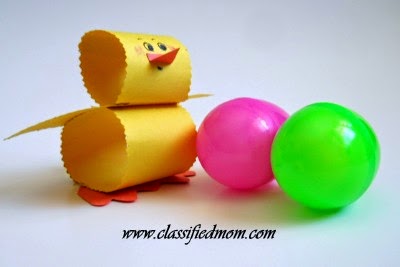 | Con cartulina, tijeras y rotuladores , se hace hueco el cuerpo, para poder alojar los huevos de plástico, que contendran algún regalo. |