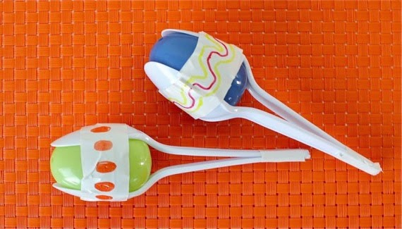 | Mi favorito: maracas, con huevos de plástico, rellenos de alpiste, arroz o sopa (dependiendo del sonido que prefieres que emitan), dos cucharas de plástico, y sujeto con celo decorativo (washi tape) |