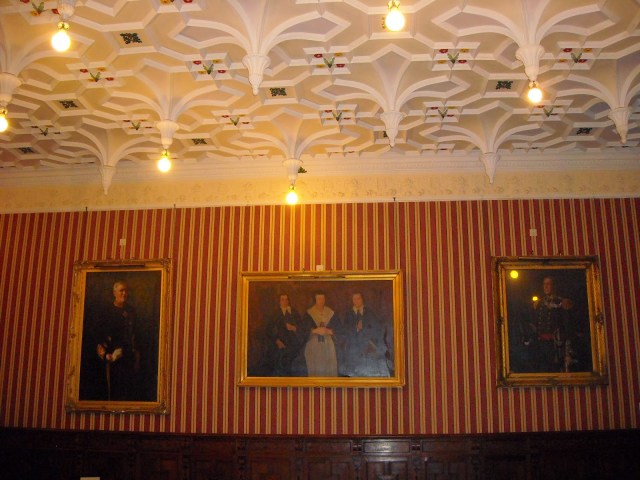 | Chimenea de la biblioteca, rodeada de retratos de familia |