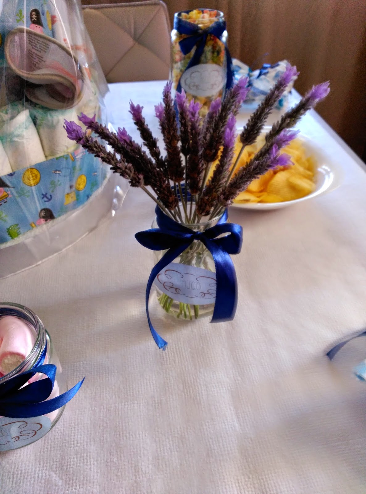 | Detalle de tarro con lazo azul, etiqueta con nomre y lavanda |