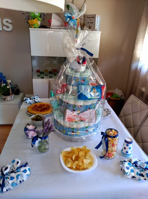 | Foto de la mesa preparada con la tarta de pañales en el centro. |