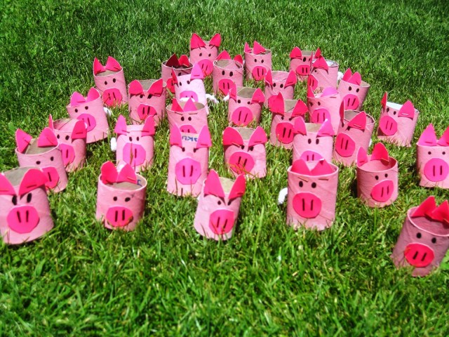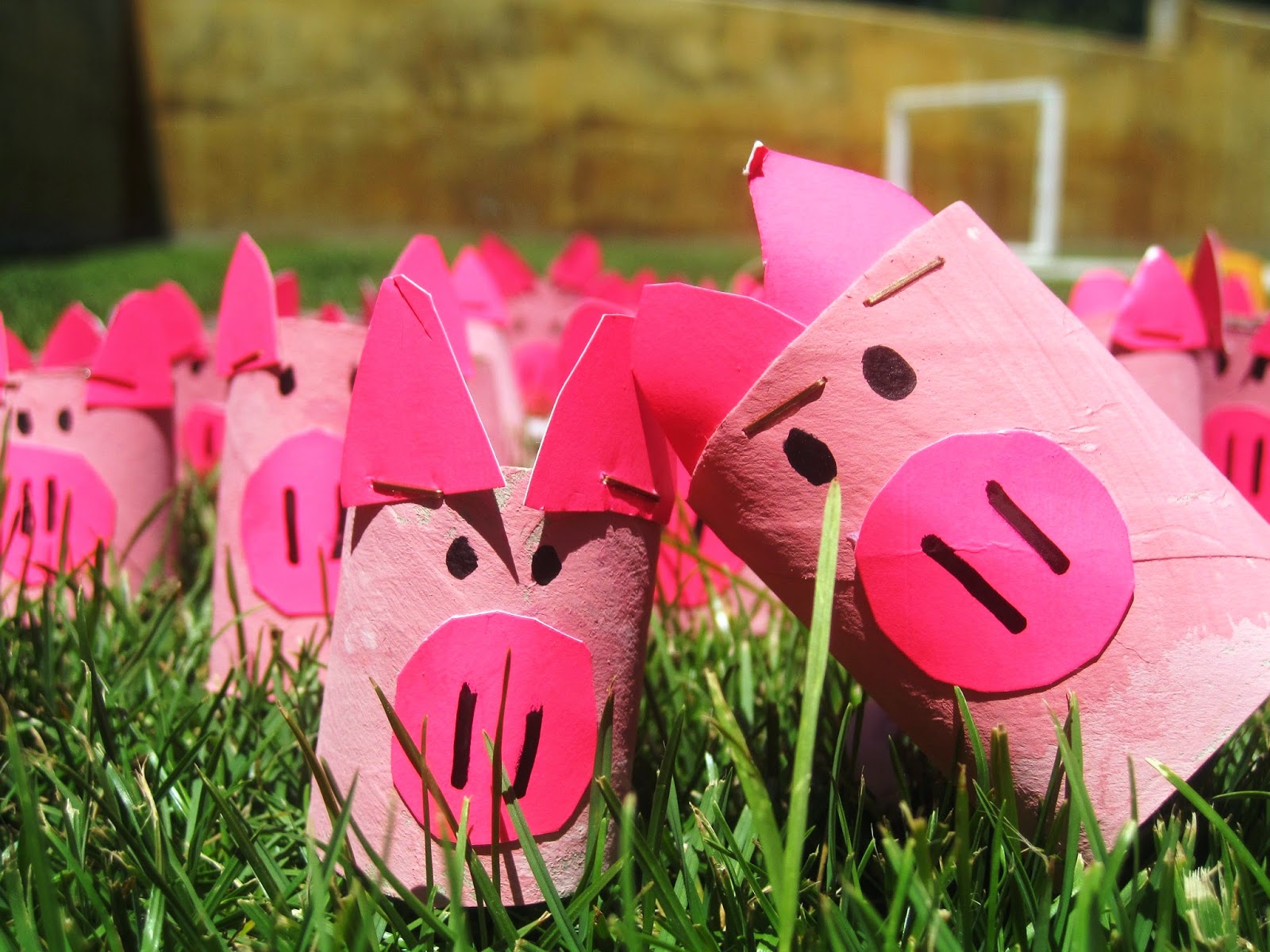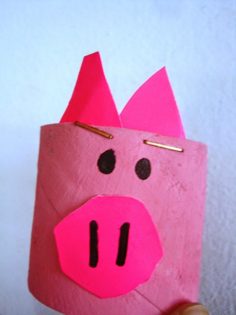 Pintar el rollo, dejar secar. Recortar orejas y hocico. Pegar hocico y grapar las orejas. Finalizar el cerdito pintando los ojos y la nariz.