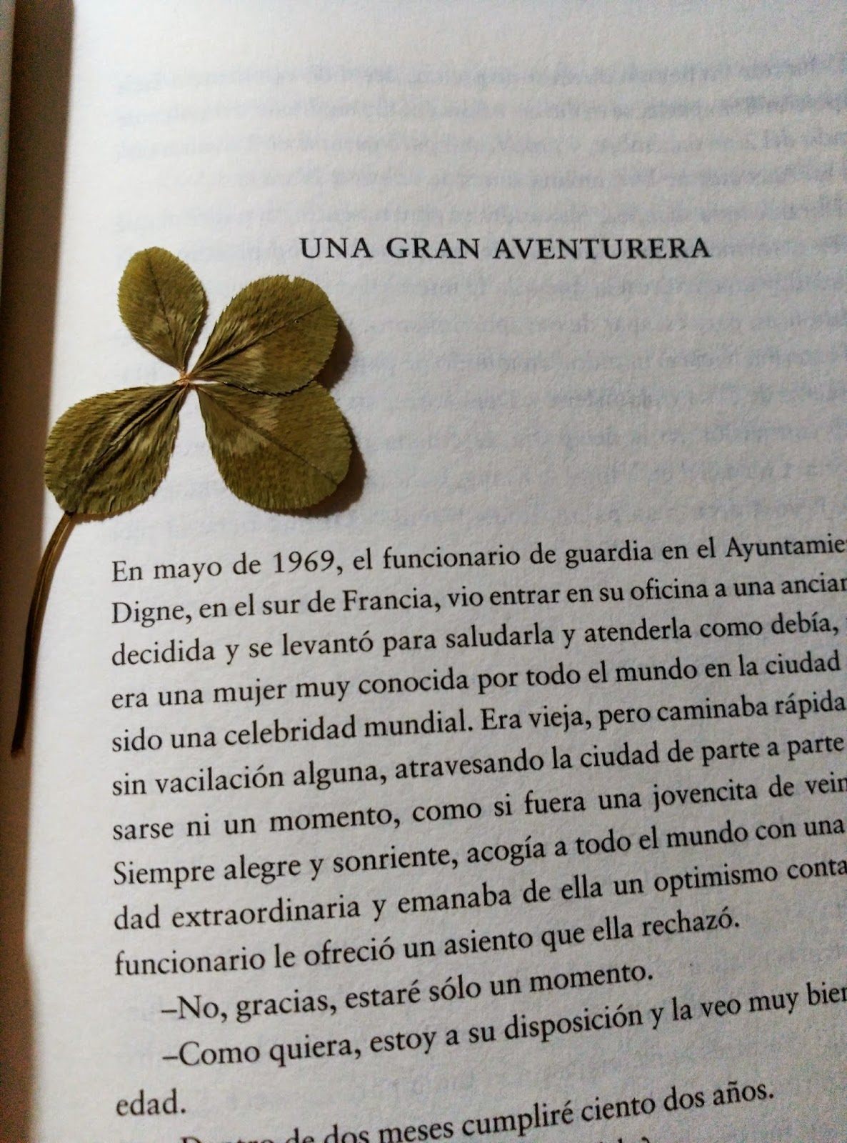 Cuando llegue, a la página 41, el relato que en ella comenzaba se titulaba «La gran aventurera», y allí, entremedio de las dos páginas, un trébol de cuatro hojas disecado…… menudo hallazgo!!!! Menudo regalazo!!!