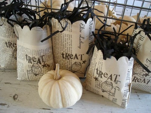 | Y mis favoritas, con papel de periódico, completamente handmade. Se cierran tipo sobre ( reforzar la parte de abajo poniendo el papel doble o triple,así no se romperá aunque tenga mil caramelos), recortamos con forma la parte de arriba y podemos decorar con rotuladores, gomets o con sellos de scrapbooking. |