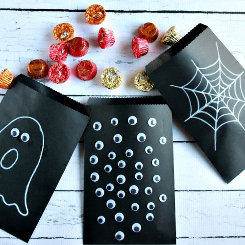 | Bolsas negras de papel, decoradas con pintura blanca y ojos móviles de pega |