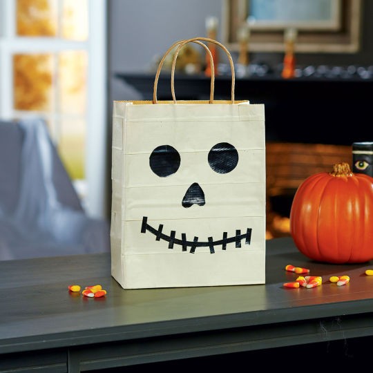 | Otra bolsa de papel, pintada y decorada con washitape negro o papel de pegatina negra. Se puede pintar con permanente negro y listo. |