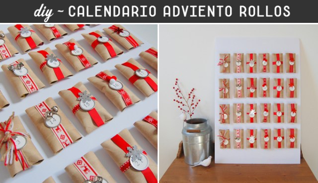 | Y otro calendario de adviento, con rollos y cinta navideña. |