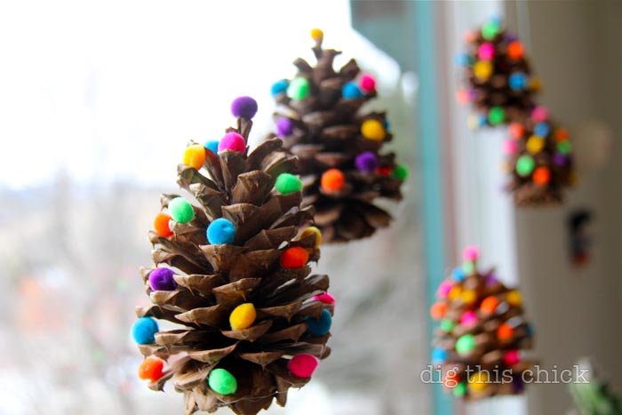 | Piñas decoradas con pompones, me gusta por lo alegre y sencillo. Para pegar los pompones, usar silicona de pistola. |