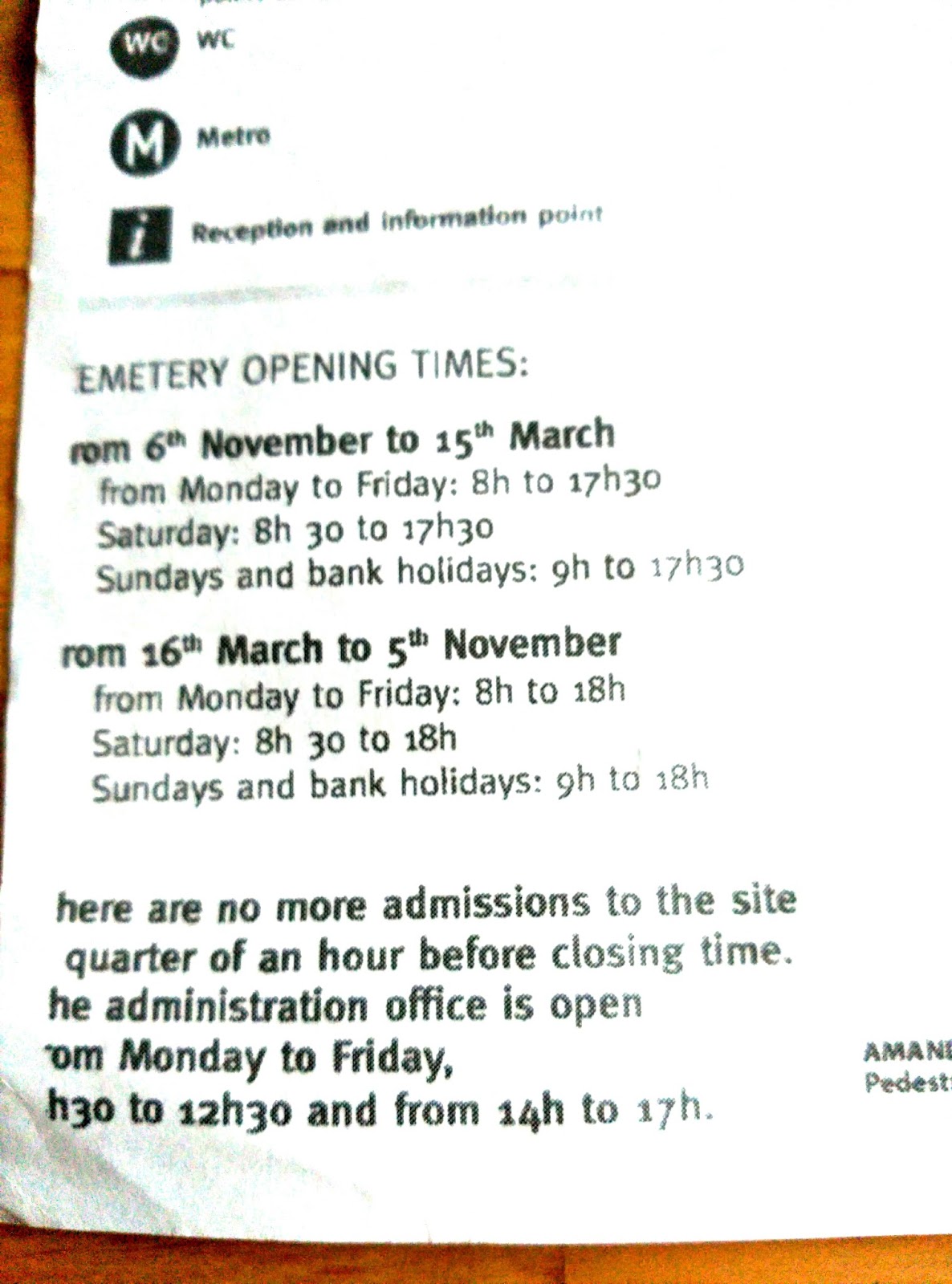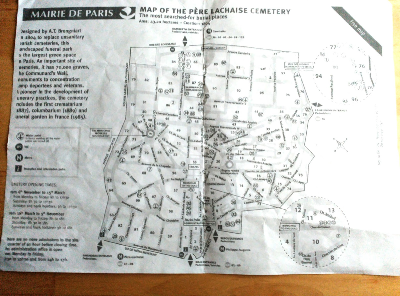 Esta vez, tenía claro, que quería visitar , y con el plano en mano me lance a ello. A muchas de estas tumbas, llegue casi sin mirar el mapa, otras me costaron de encontrar y tengo que agradecer a personas anónimas (no se si eran trabajadores del cementerio) que me ayudaron sin yo pedir ayuda (esto me paso en muchas ocasiones durante mi estancia en París, que la gente me preguntara si necesitaba ayuda, cuando me veían con cara de despiste. También decir, que mucha gente me pregunto por direcciones, lo cual quiere decir que, hubo momentos, en los que pasaba por autóctona).