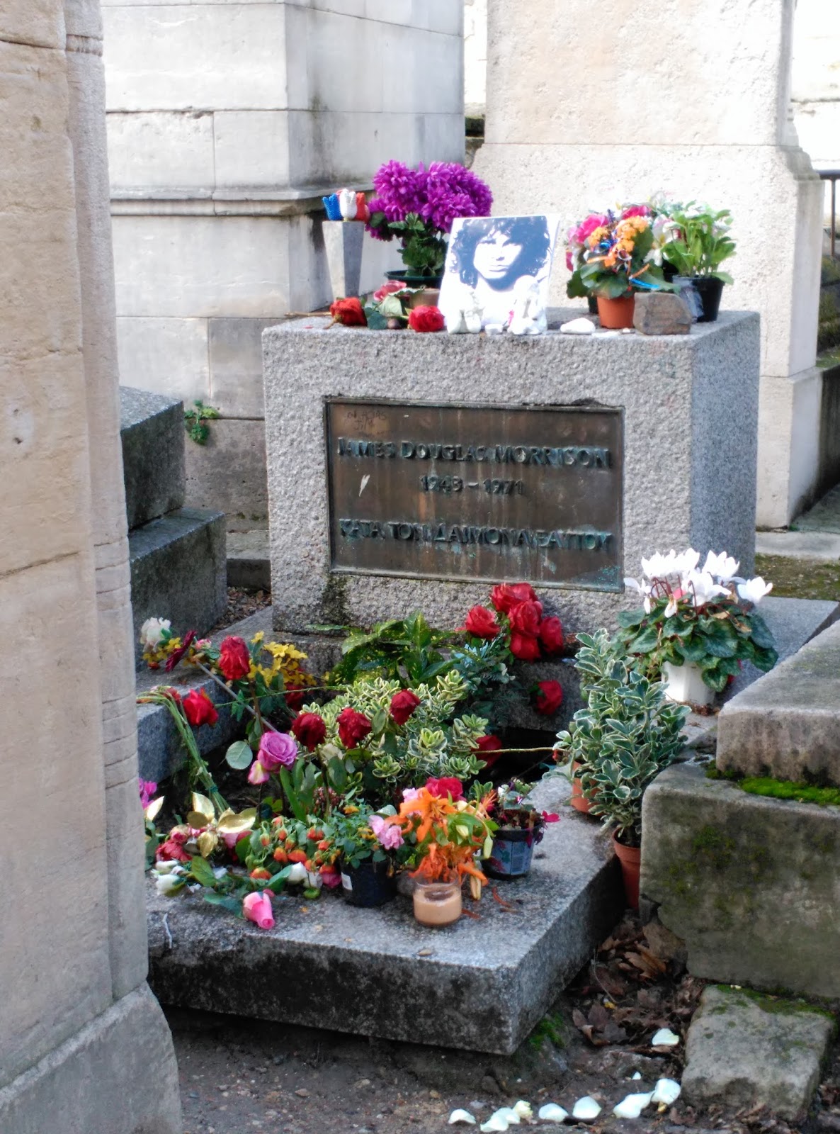 | Jim Morrison (cantante,compositor y poeta), división 6. Esta tumba también esta vallada, y no te puedes acercar a más de 1 metro. La valla que la rodea, esta cubierta de cintas,pulseras,pegatinas,peluches,veladas y demás presentes que dejan los fans. Me explicaron que esta vallada ya que se estaba hundiendo, de la cantidad de personas que pasaban, se sentaban y hasta incluso se echaban sobre la tumba. |