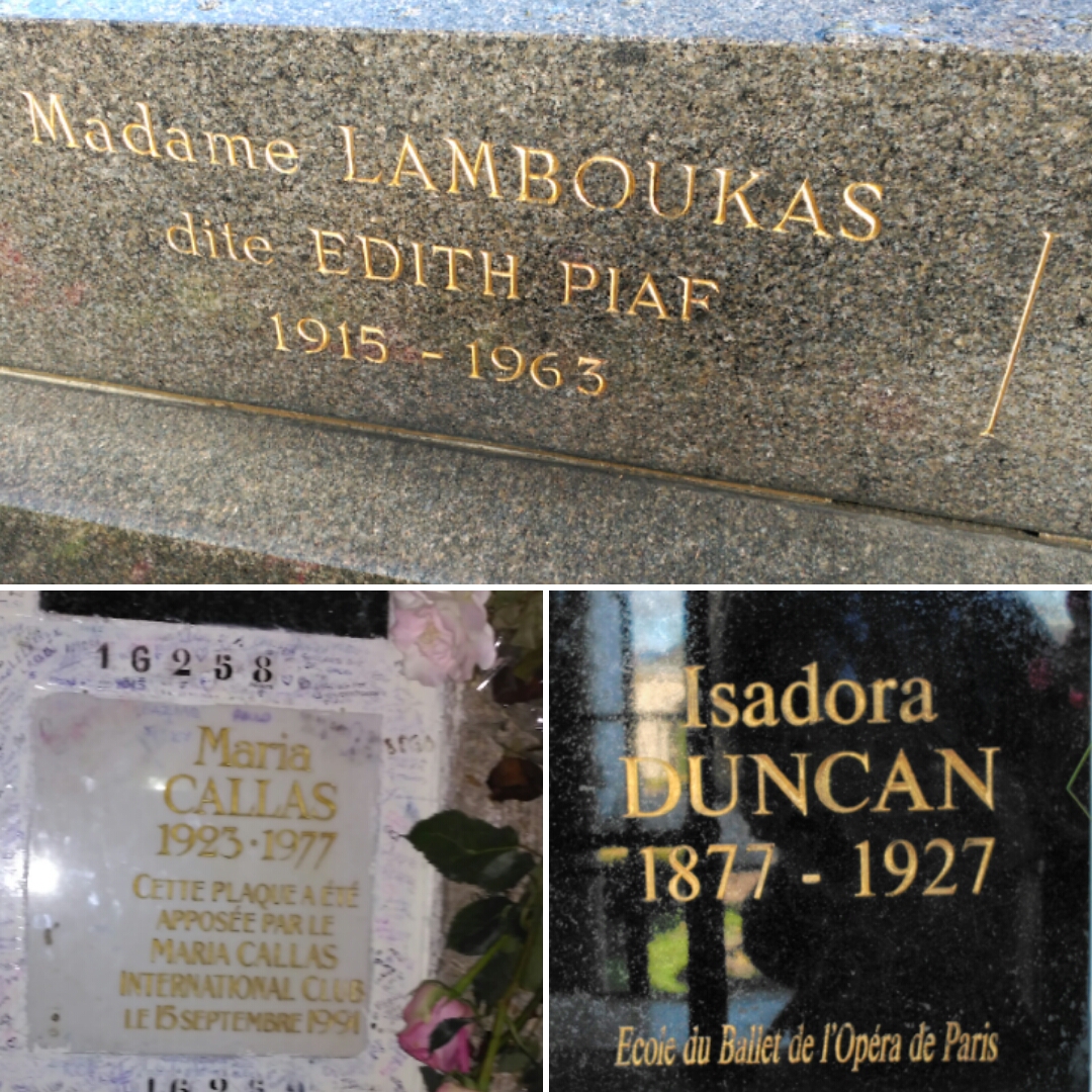 | La tumba de Edith Piaf (cantante francesa), que se encuentra en la división 97. Isadora Duncan (bailarina y coreografa americana), cuyas cenizas están ubicadas en el columbario exterior, número 6796. María Callas (Cantante) cuyas cenizas, están en el columbario subterráneo, en la primera planta del subsuelo, entrando a mano izquierda, primer pasillo, lateral izquierdo, número 16258). |