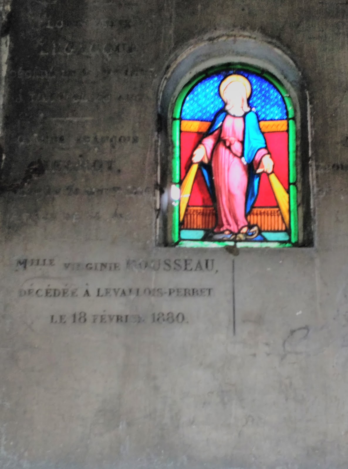 | Tumba de Virginie Rousseau, no es una persona famosa, no se quien era. Lo curioso es, que , todas las veces, que he ido a este cementerio, he encontrado esta tumba sin querer. Es decir, que llego allí, sin saber donde esta. La vidriera es preciosa y lo más curioso, es que murió justo cien años antes de que yo naciera….es o no es señal del destino??? |