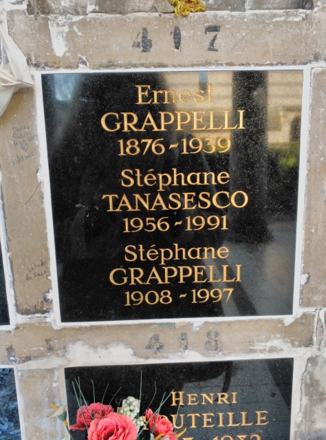 | Y paseando entre las cientocienmil lápidas del columbario exterior, encontré a Stéphane Grappelli , uno de los grandes violinistas de jazz, y que junto a Django Reinhardt compusieron Minor Swing, pieza popular de jazz. Curioso, porque ni sale en el mapa ni yo sabia que estaba allí enterrado. |