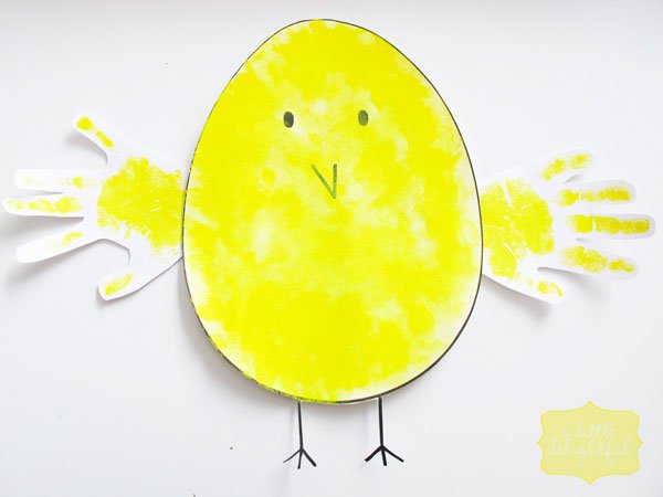 | Huevo pollito para hacer con los más pequeños, las alas son las manos de los niños, estampado con pintura de dedos. |