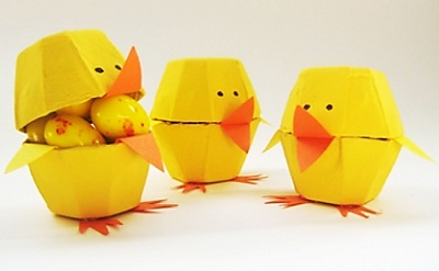 | Caja-pollito, con hueveras de cartón, pintadas y decoradas |