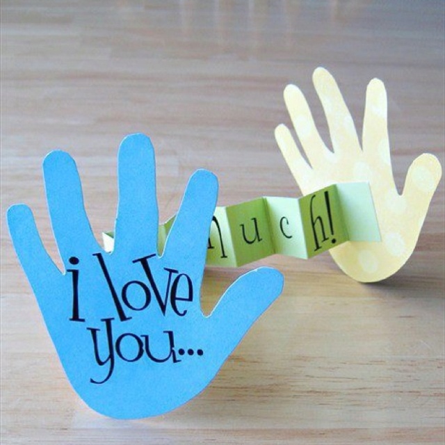 | Otra tarjeta de felicitación, con la forma de las manos del niño y un mensaje en su interior en forma de acordeón. |