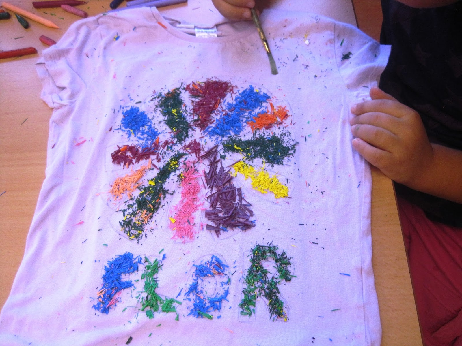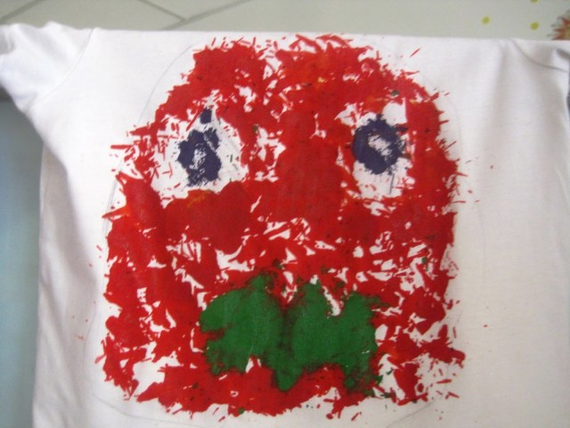| Dibujamos en la camiseta en blanco (a la que previamente hemos puesto un cartón para separar la parte delantera de la trasera) con bolígrafo el motivo a rellenar. Lo rellenamos con nuestras minas de colores |
