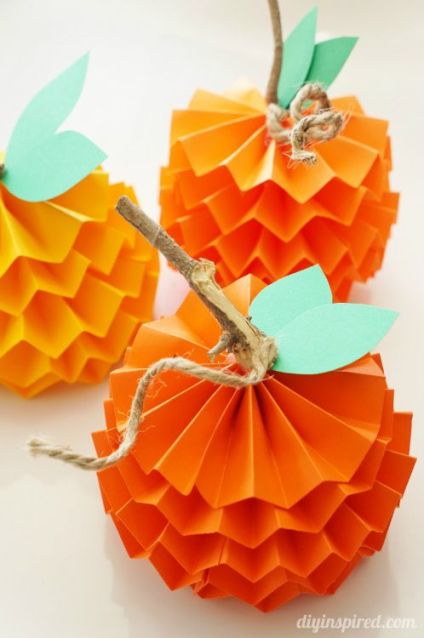 | Otro DIY sencillo: dolando hojas de color naranja y dándole forma de acordeón. Las colgamos de una rama y…. listo! |