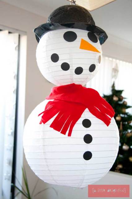 | Para decorar zonas comunes. Este muñeco de nieve, hecho con pantallas de lámpara de papel ( podemos comprarlas en tiendas de chinos o AQUÍ ) se puede trasformar en un Papa Noel (spray rojo y añadir gorro, cara y barba y cinturón de papel) en unas bolas decorativas gigantes (spray dorado y brillantina) |