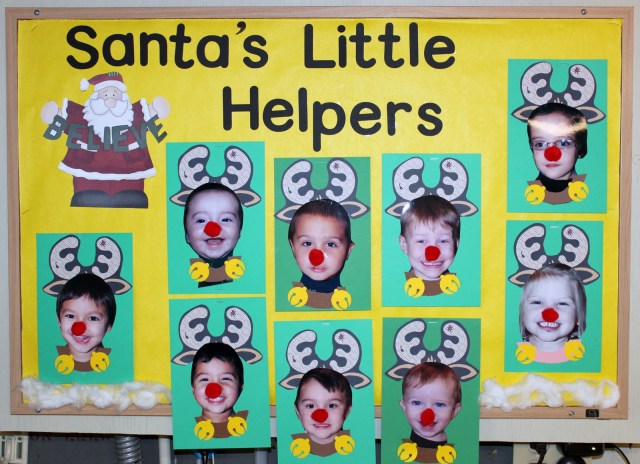 | Cuadro de ayudantes de Papa Noel. Puede servir para decorar una pared o pasillo. Con las fotos de los niños, de nariz un gomet y podemos hacer las orejas de reno cn algodón. |