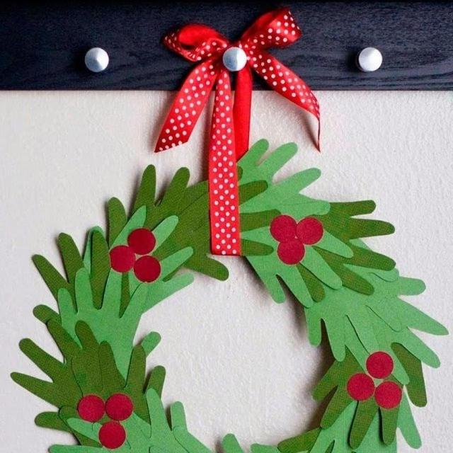 | Con el contorno de las manos de los niños de clase, podemos hacer esta corona para decorar la puerta, o disponerlas en forma de árbol de navidad. |