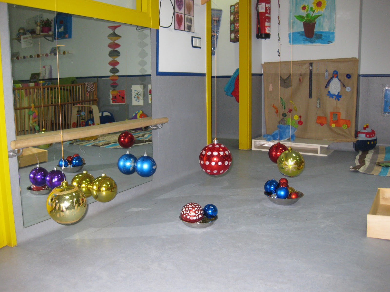 | Para decorar la clase de los bebes, utilizar bolas navideñas colgadas, y emplearlas a modo cesto de los tesoros. |