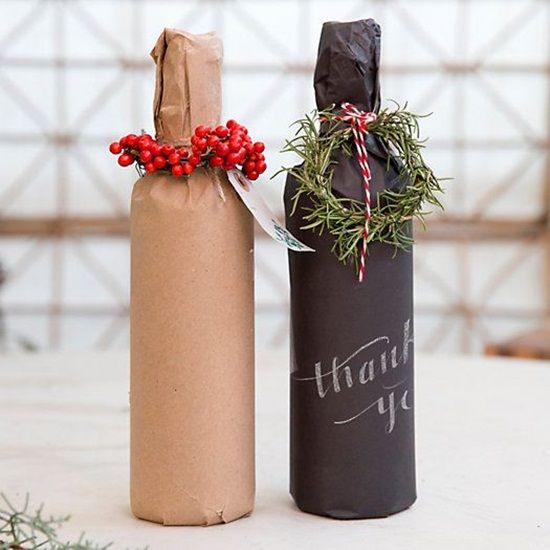 | Ideas para envolver botellas de vino o de lo que sea, uno de los regalos más recurrentes en esta época. Muy sencillas, con papel negro, podeís incluir mensajes con tiza blanca( escribirlos al momento de entregar, para que no se emborrone) |