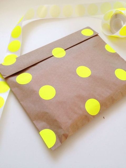 | Y por último, una idea muy sencilla, papel continuo marrón (barato y fácil de conseguir), decorado con gomets de colores, una idea muy chula, que podeís hacer con ayuda de los peques de casa. |