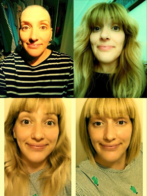 SEPTIEMBRE – Mes de empezar la tan temida QUIMIOTERAPIA. No voy a mentir, lo he pasado mal, pero pensé que iba a ser peor. Arriba a la derecha podéis ver el melenón que gastaba a comienzo de verano. En julio cuando me dijo la ginecóloga que me despidiera del melenón, me hice el corte que veis en la parte de abajo y que me sirvió de referencia a la hora de encargarme la peluca. Al principio pensaba ir con pañuelo, porque no tengo nada que esconder, pero la verdad es la peluca normaliza mucho la situación, tu te ves más «normal» y la gente te mira pero es diferente, yo creo que algunos deciden si es peluca o no, y otros simplemente ni se fijan. La foto de arriba a la izquierda, la tome una hora después de volver de la peluquería de raparme al cero patatero. Otra cosa que me espera horrible y por lo cual lloré mucho, y la verdad que cuando llego el momento, ni fue tan terrible ni me veía mal, me veía bonica y con los ojos enormes. Y estaba liberada,fue una liberación. |