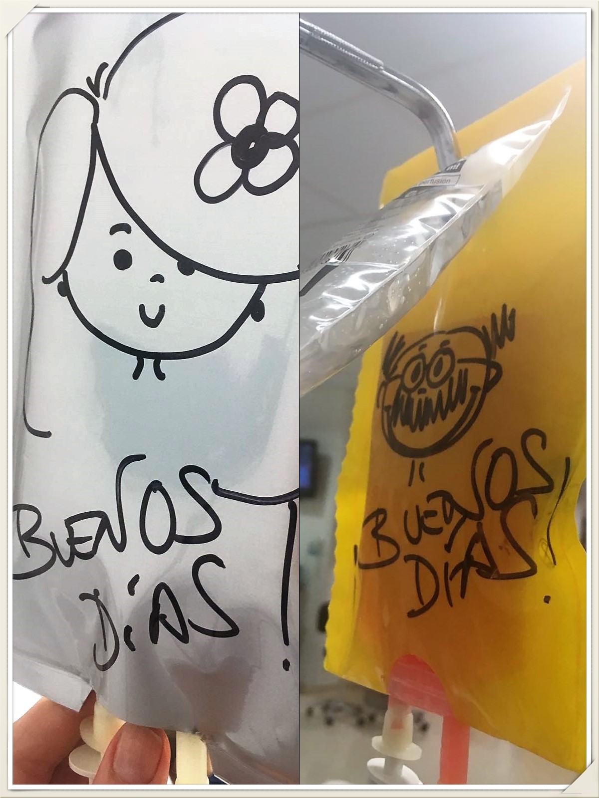 NOVIEMBRE – Mes de la cuarta quimio, con el cuerpo ya agotado de tanto veneno sanador, empezó a salirme la toxicidad por todas partes provocandome reacciones alérgicas que se transmitían en quemaduras en pies, manos y cara. Y que, a pesar de cambiarme la quimioterapia, se ha vuelto a repetir en la quinta y sexta quimio. Mal mes, por otros muchos motivos, pero bueno, ya pasó y esta en el olvido, en un cajoncito cerrado, que solo me voy a permitir abrir cuando flaqueén mis fuerzas. Algo bueno de las quimios: Los dibujitos tan chachis que les hacen a las bolsitas de medicina, desde una niña con su pelo y su flor a Mariscos Recio, de» La que se avecina»…..te ponen una sonrisa, si o si y estas deseando ver que dibujo te toca, ese día, en las bolsas!!! |