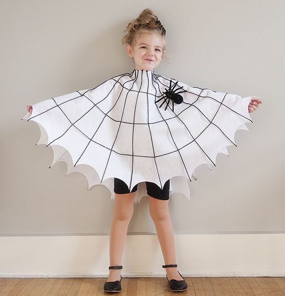 | Este también es muy fácil y resultón. Con una tela blanca, (o bolsa de plástico blanca, de la de disfraces) hacemos la capa, un redondo, con agujero en medio para la cabeza. La telaraña, podemos pintarla con permanente, hacerla con hebras de lana negra,o con papel de pegatina en negro o cinta adhesiva. |