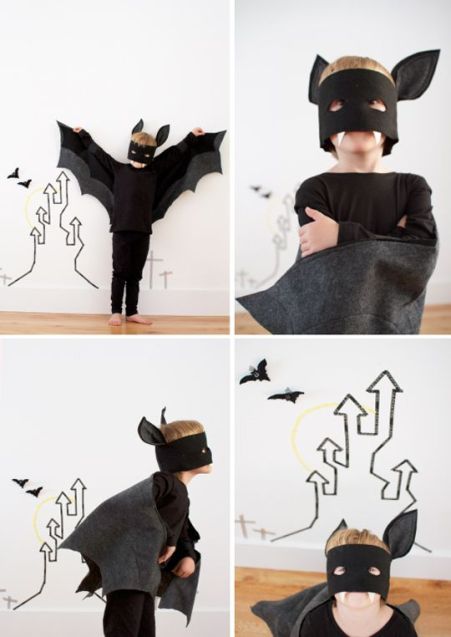 | De murciélago, vestidos de negro, solo tenemos que hacer la careta con orejas y las alas. Hay varios tutoriales en Internet. |