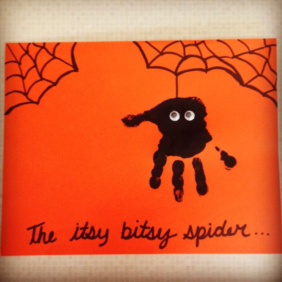 | Tarjeta de la araña Itsy, estampar la mano y pintar las telarañas. Se puede incluir en las rutinas diarias, como método de autoidentificación, mediante la localización de la araña de cada uno y colocar la mano encima y trabajar con la canción y los gestos. Os dejo el enlace a la canción en inglés: Itsy Bitsy spider y a la canción en castellano: Itsy Bitsy Araña |